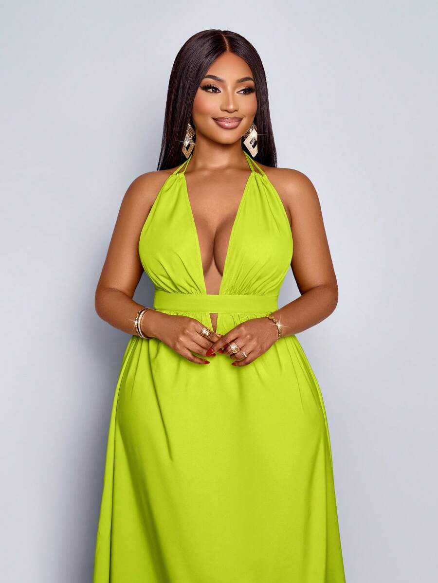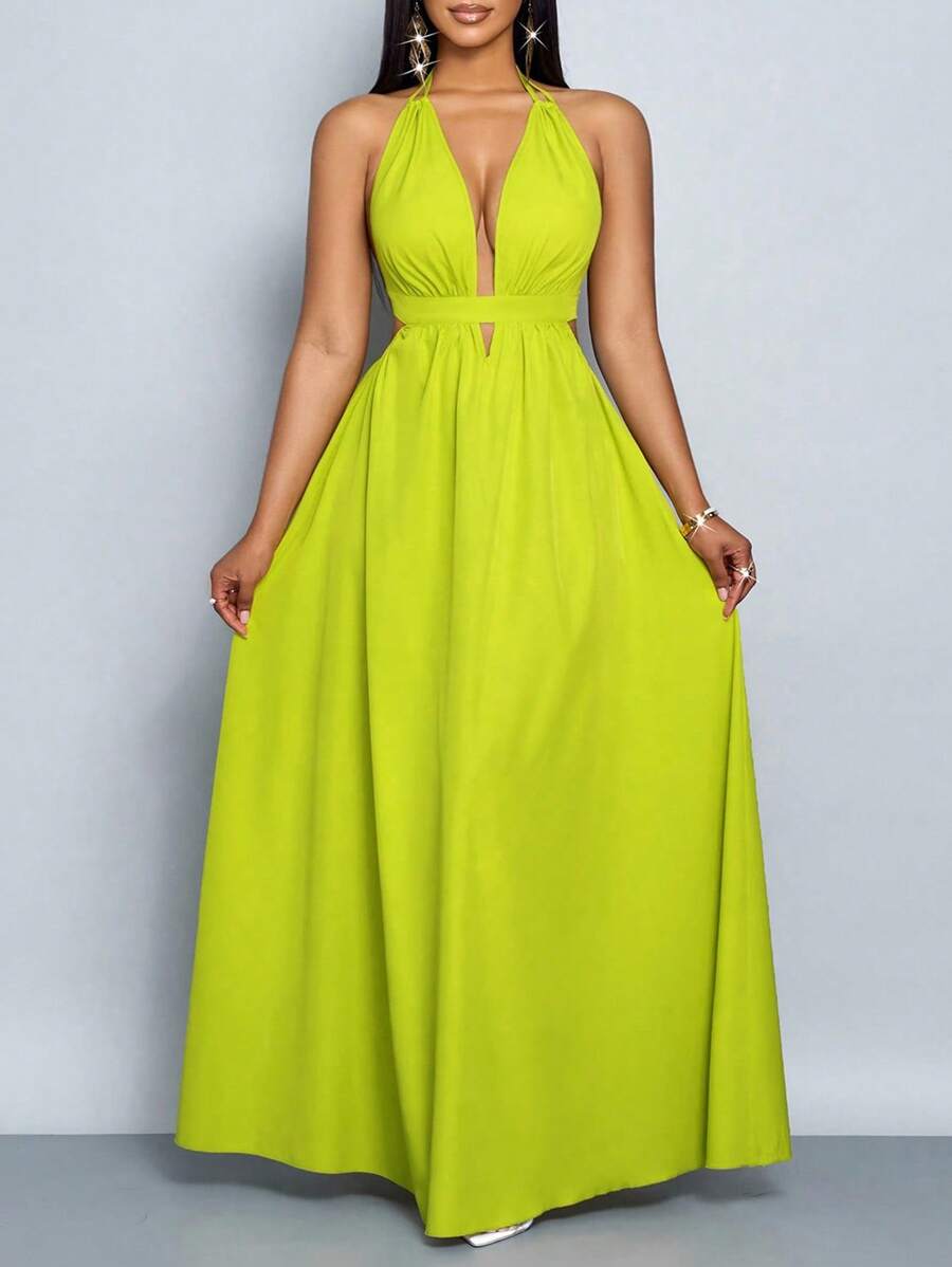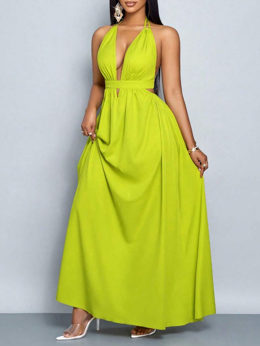 Vestido maxi de vacaciones con cuello halter en v de unicolor, con cruce trasero anudado y espalda descubierta para la playa