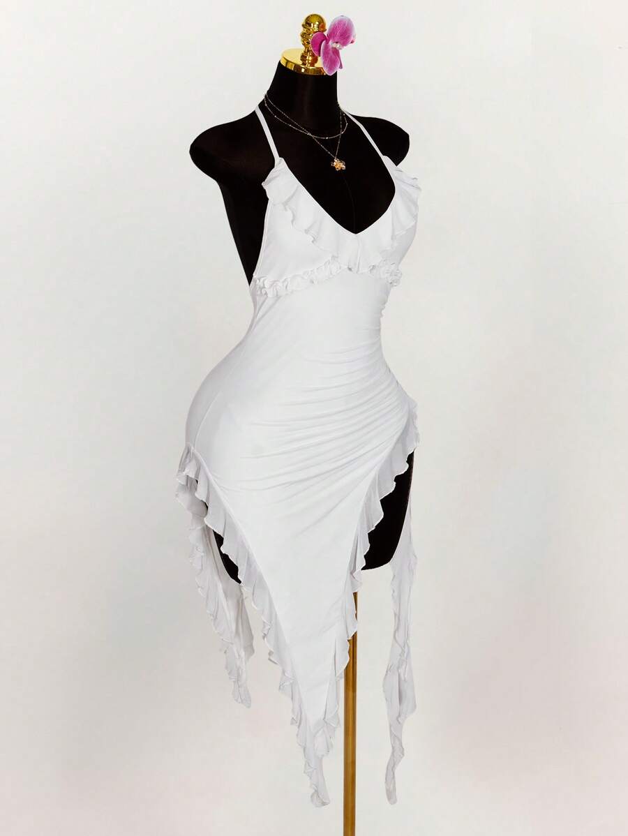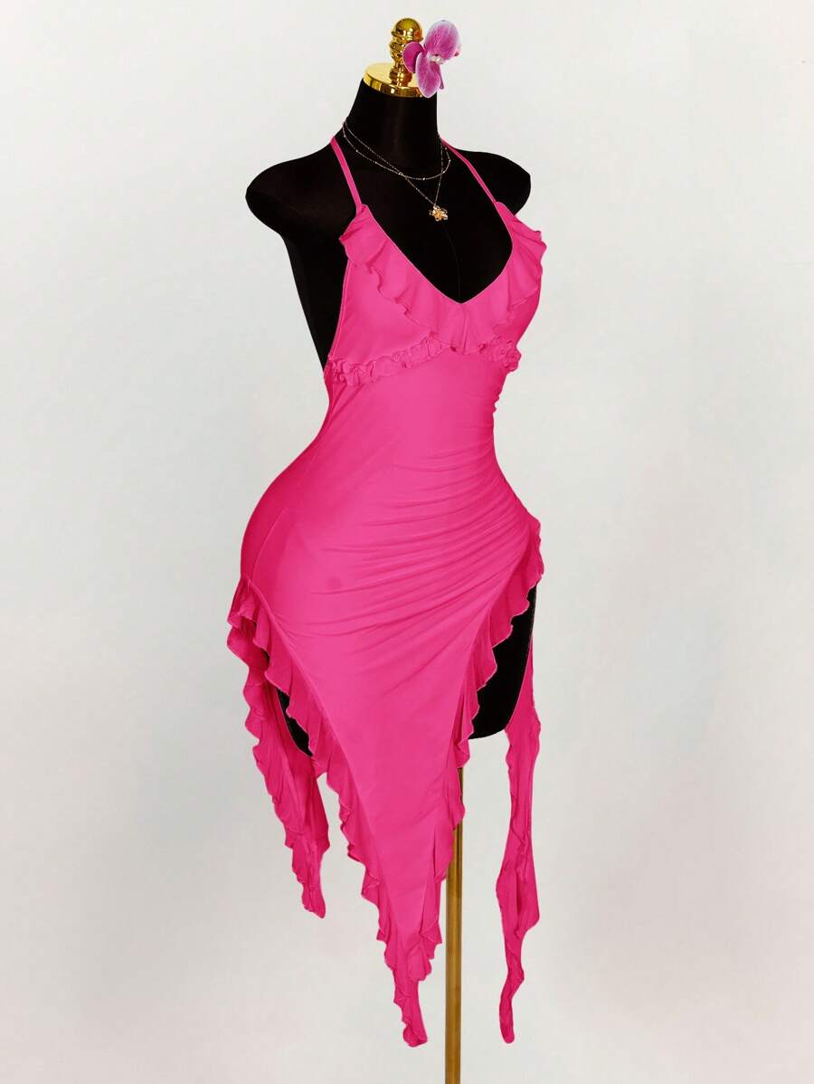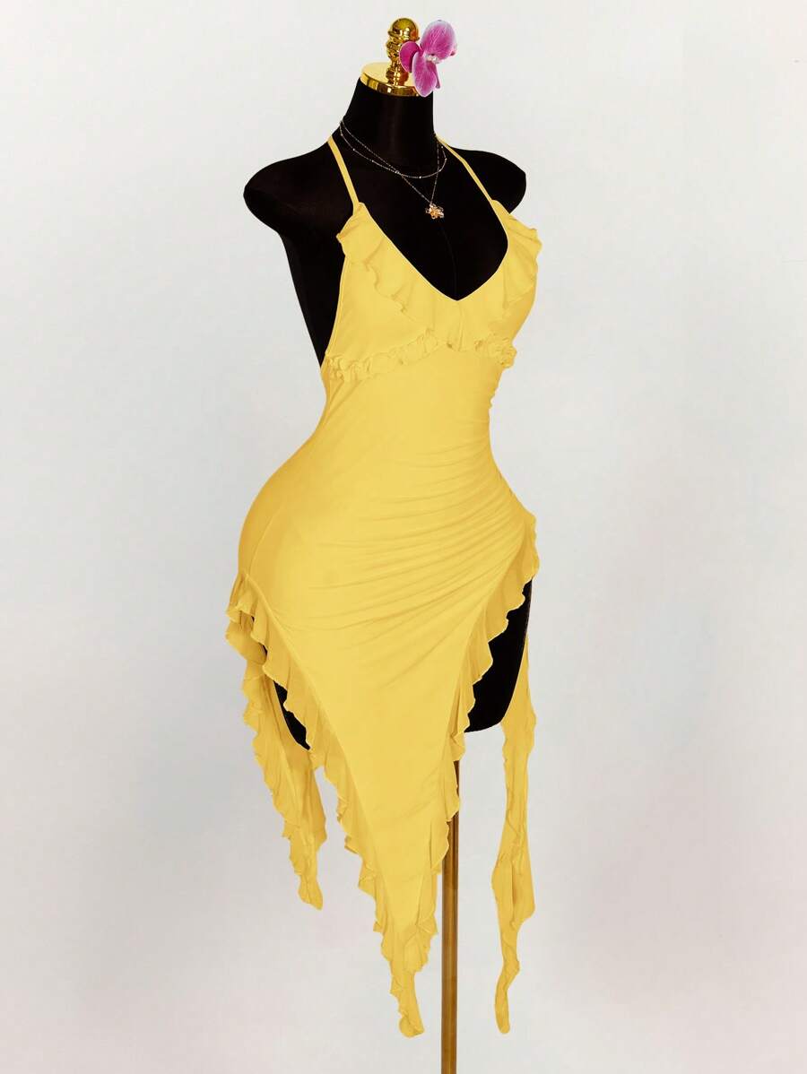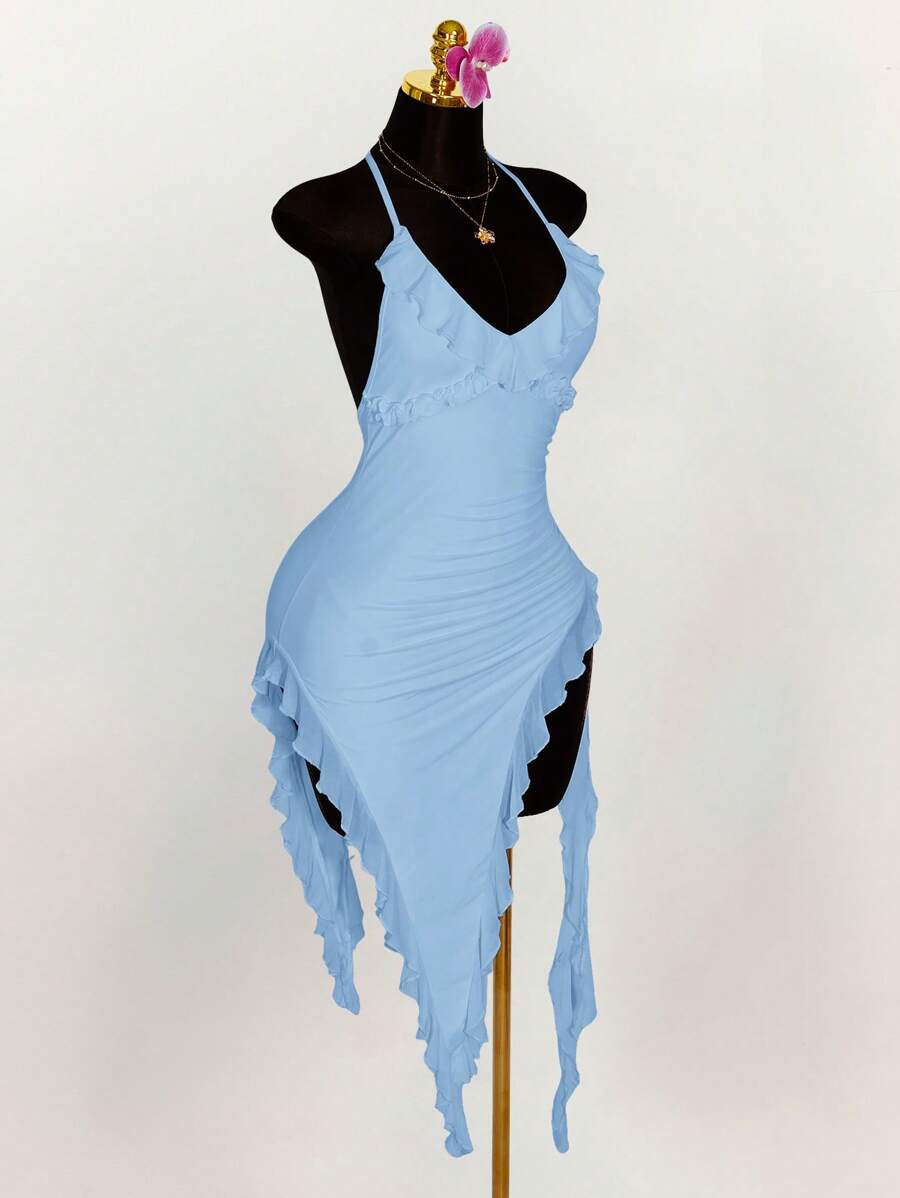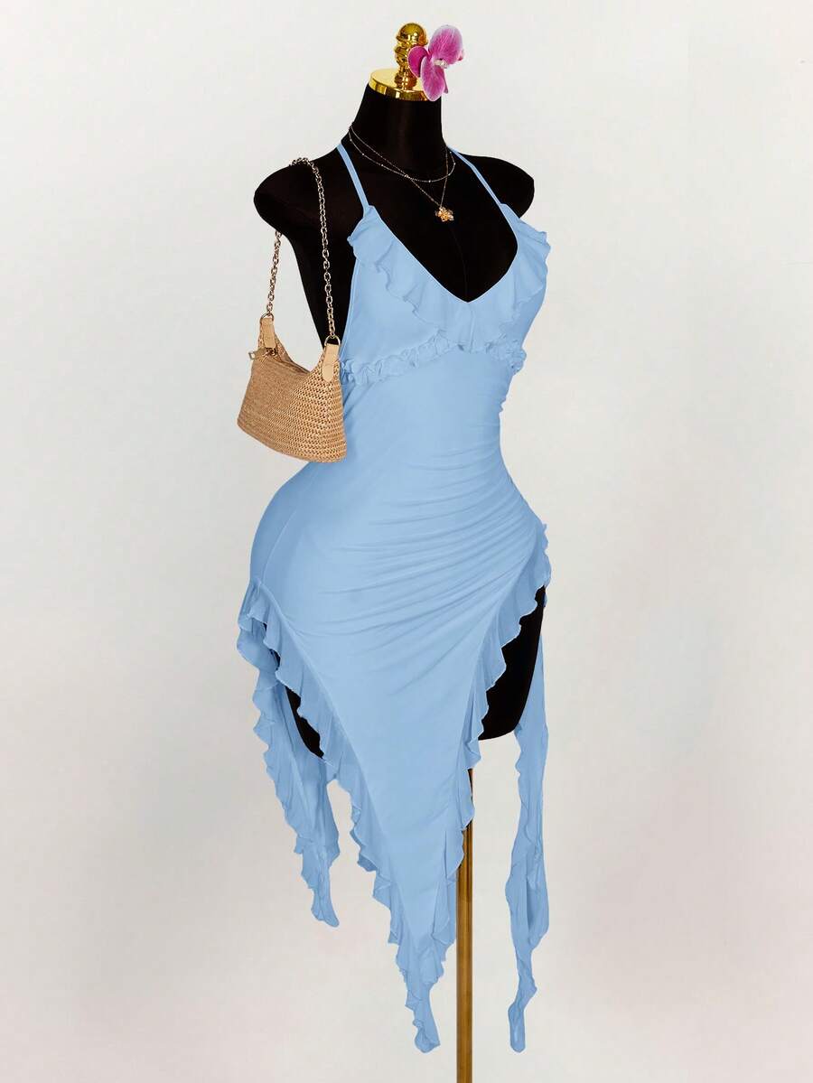 Amplova vestido halter ajustado con escote en v profundo, volantes y bajo asimetrico con volantes