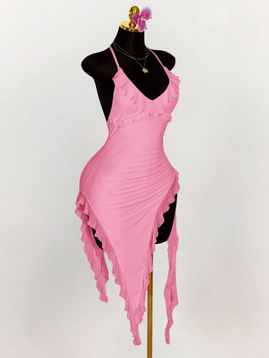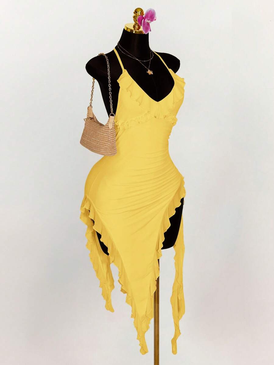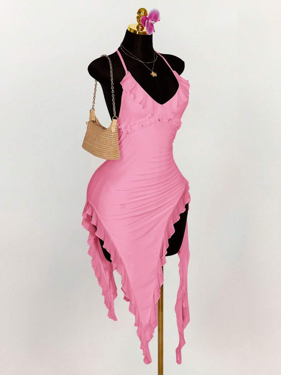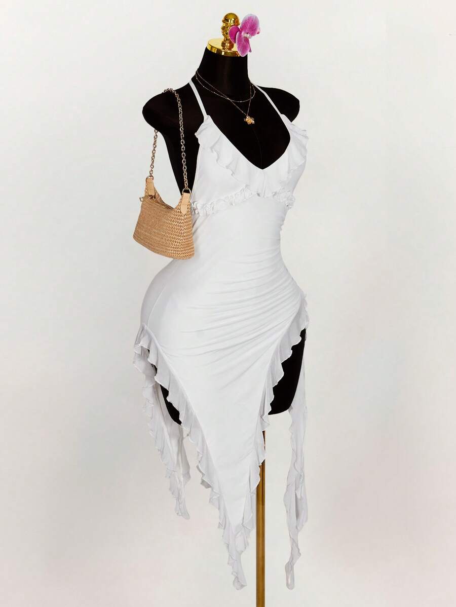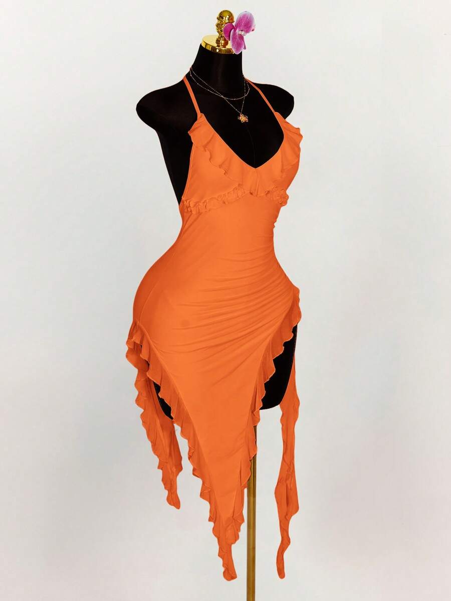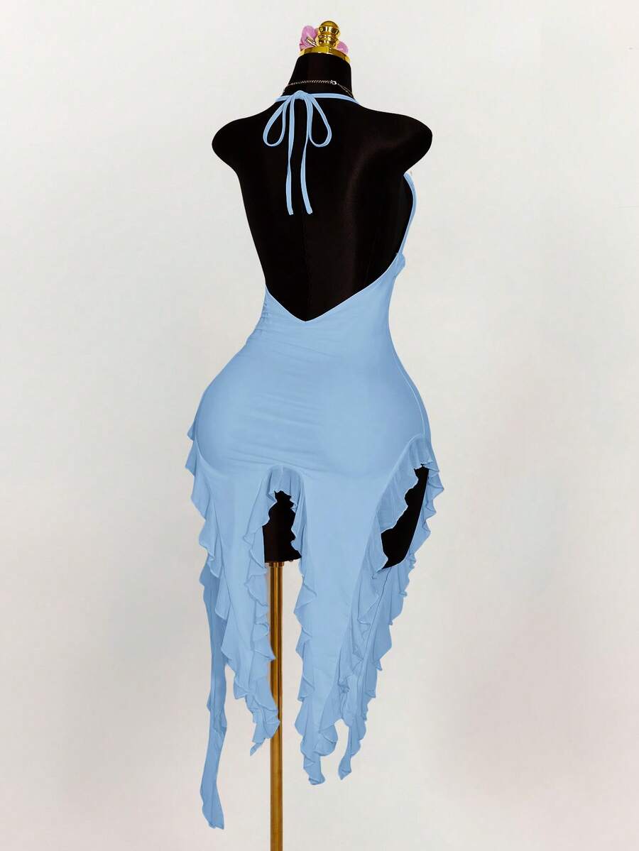 Amplova vestido halter ajustado con escote en v profundo, volantes y bajo asimetrico con volantes