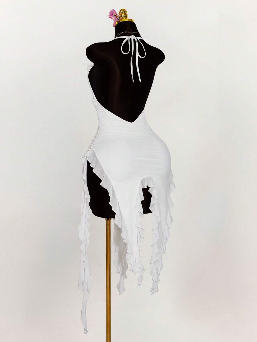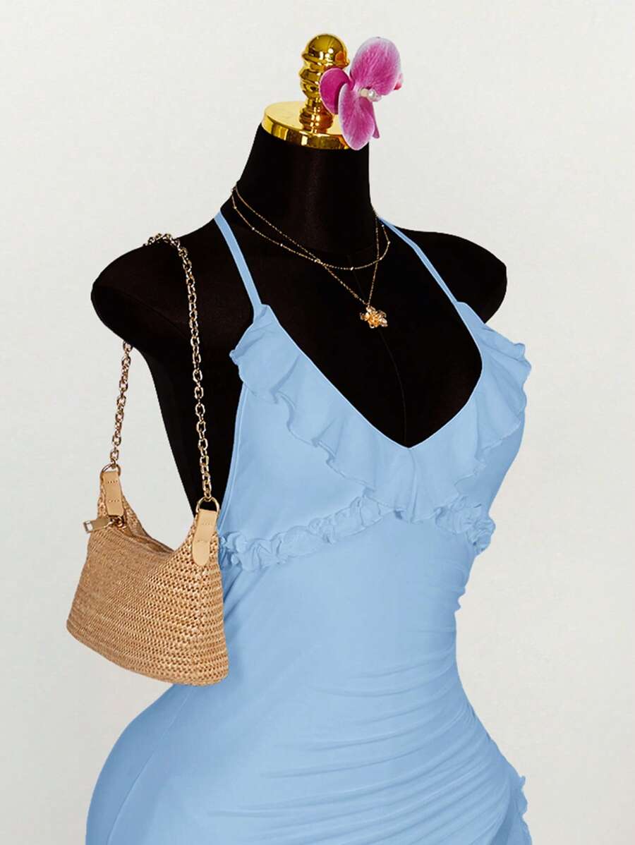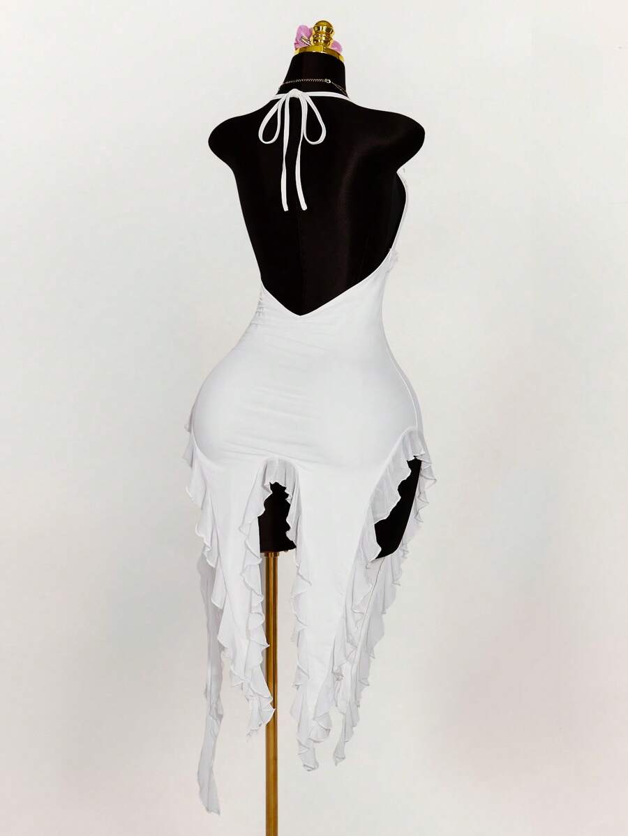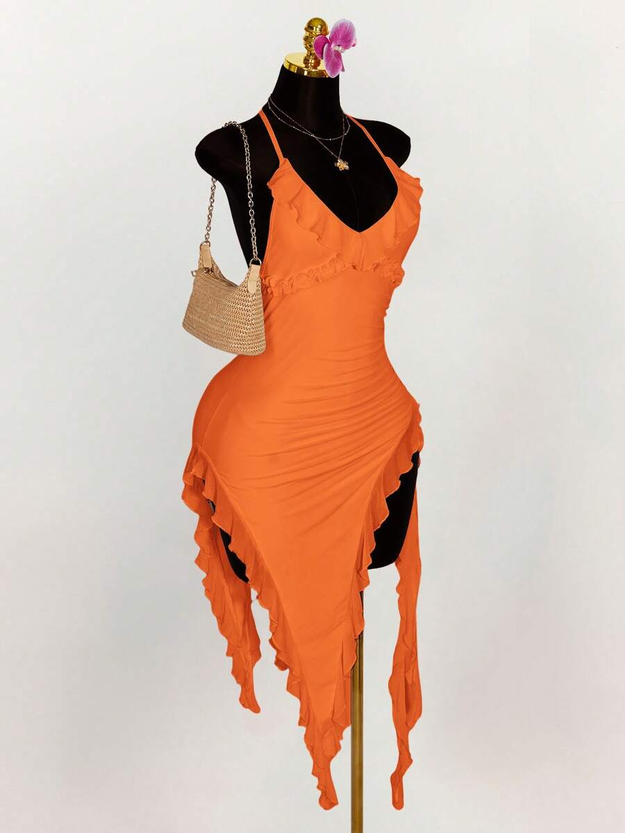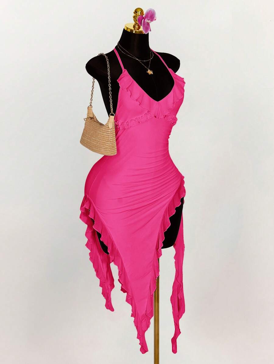 Amplova vestido halter ajustado con escote en v profundo, volantes y bajo asimetrico con volantes