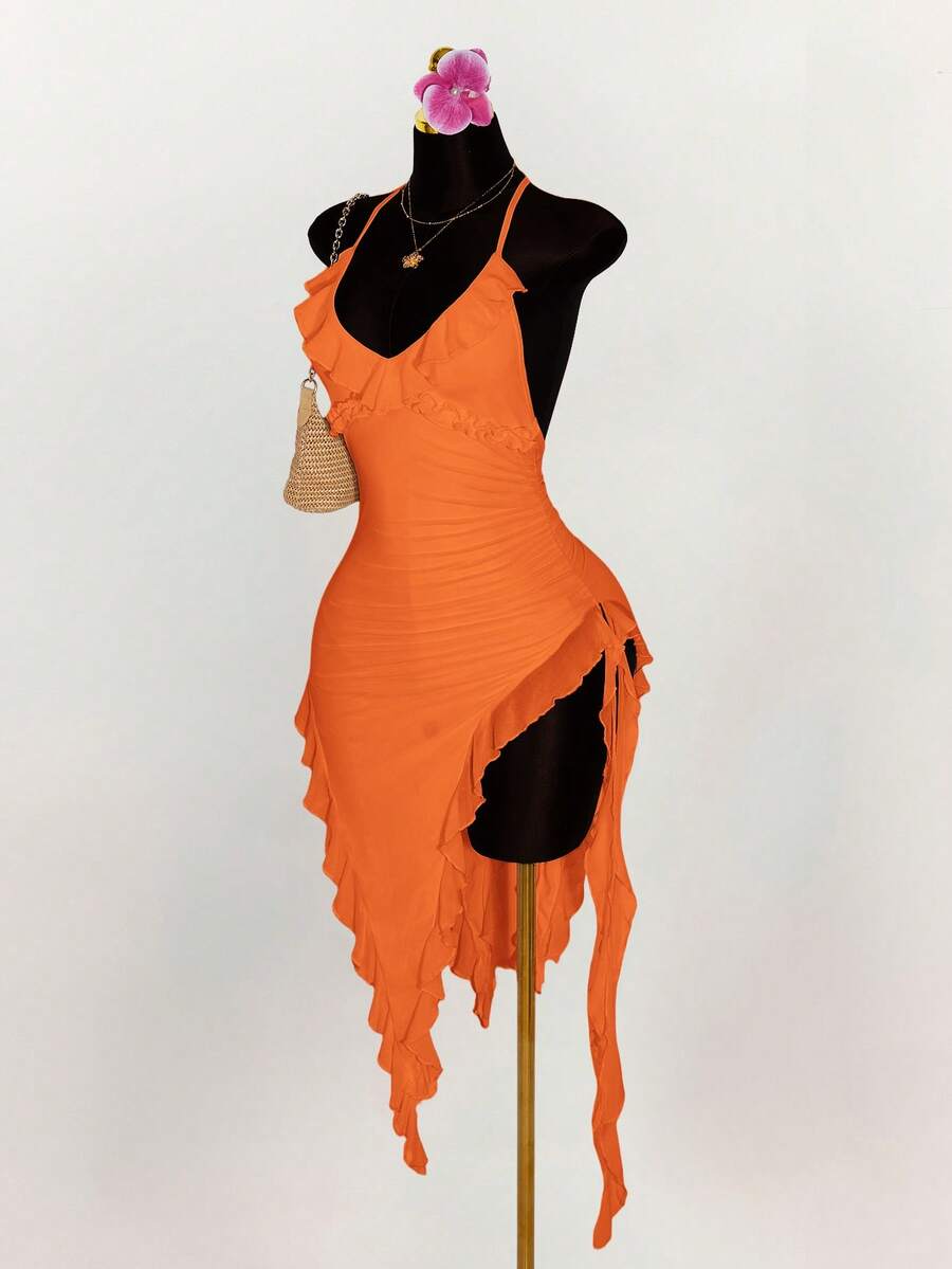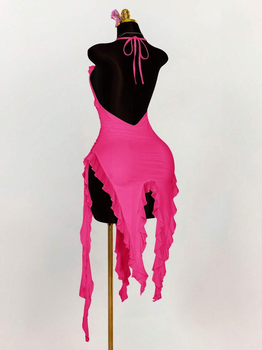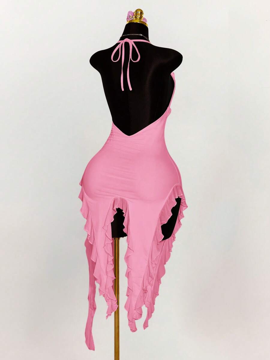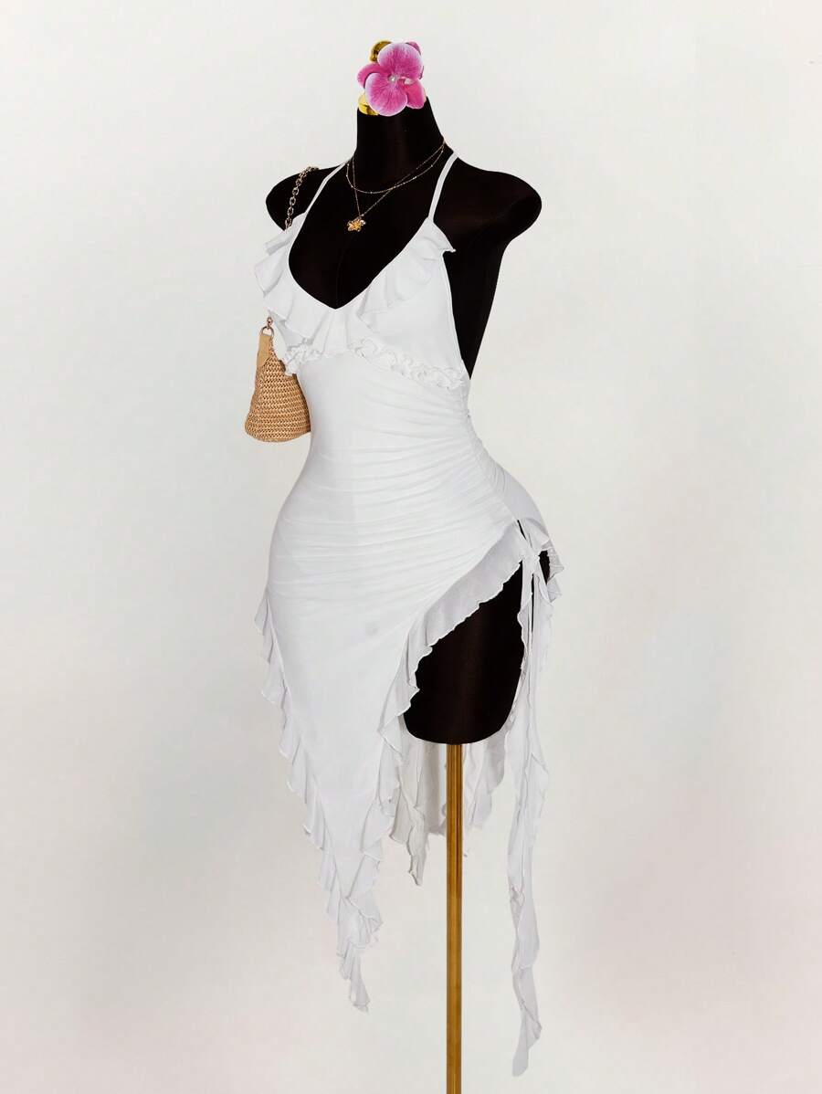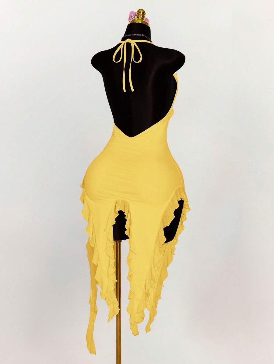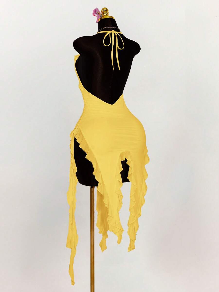 Amplova vestido halter ajustado con escote en v profundo, volantes y bajo asimetrico con volantes