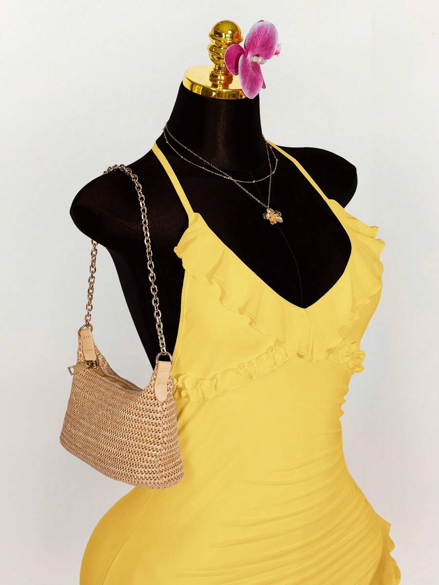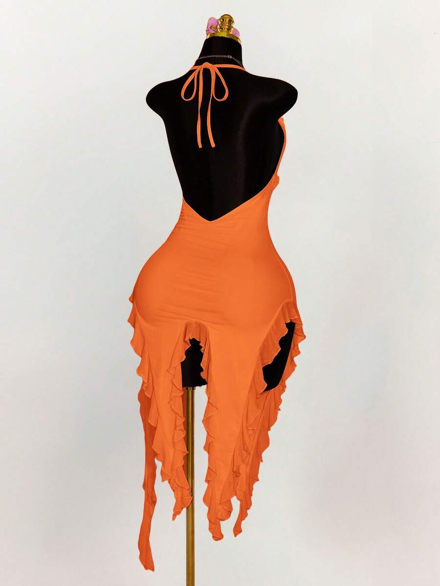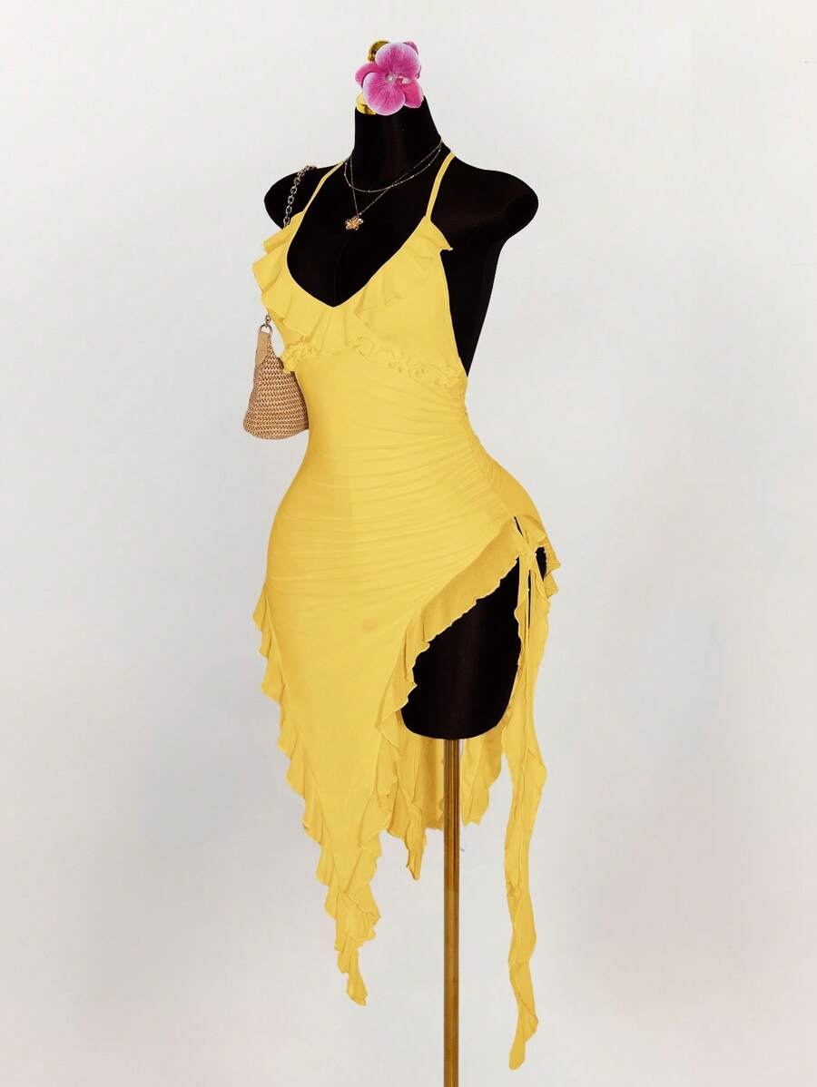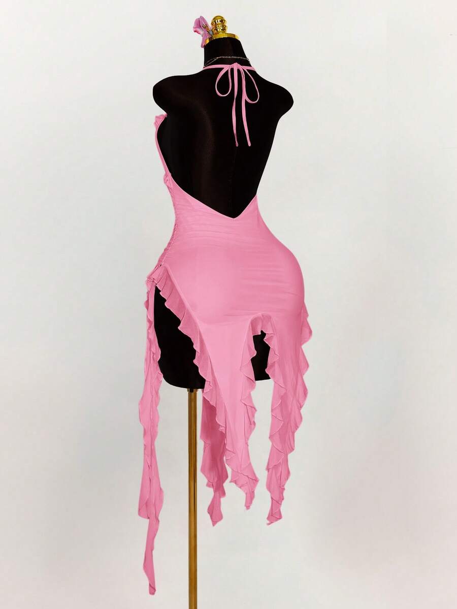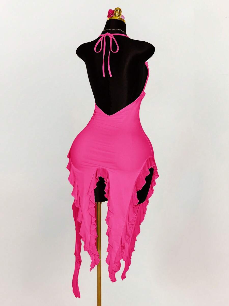 Amplova vestido halter ajustado con escote en v profundo, volantes y bajo asimetrico con volantes