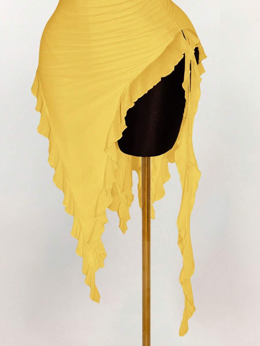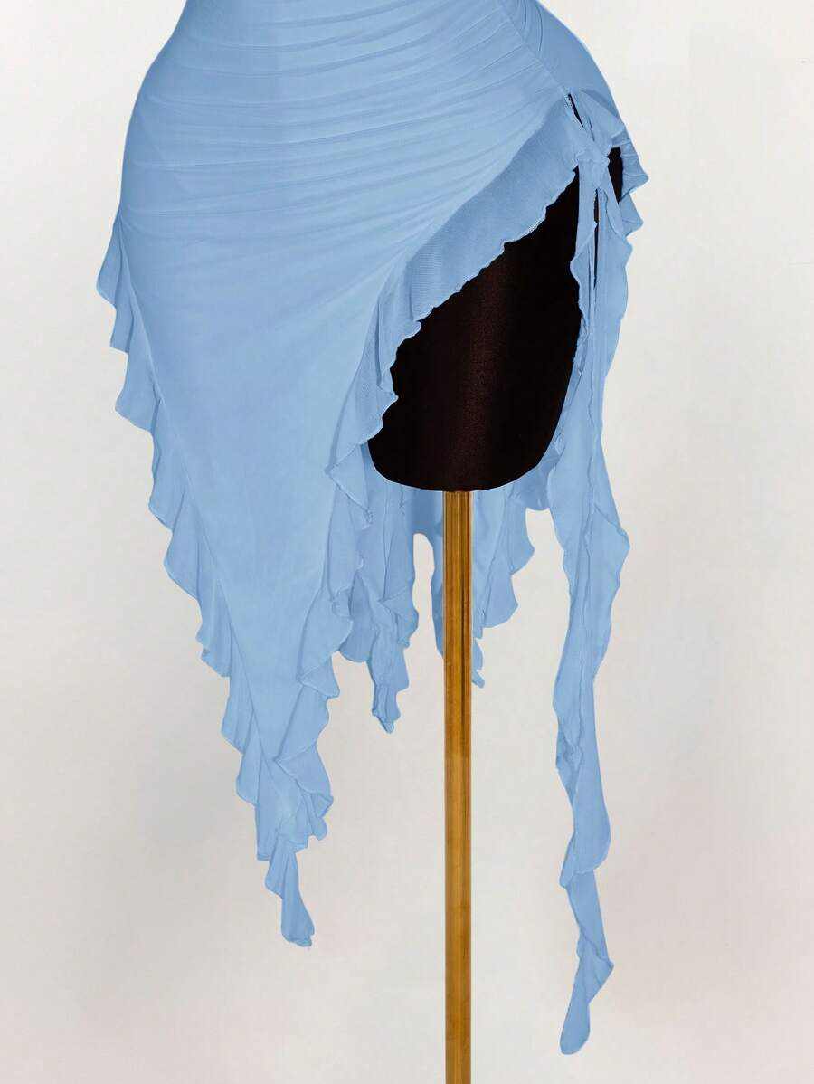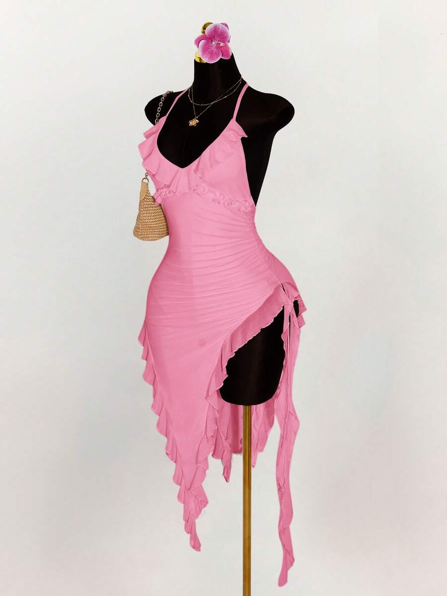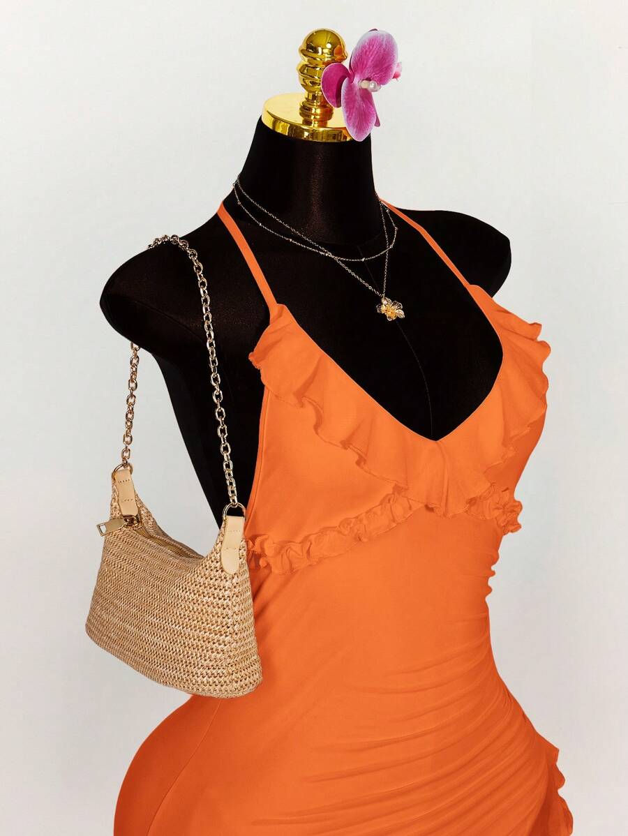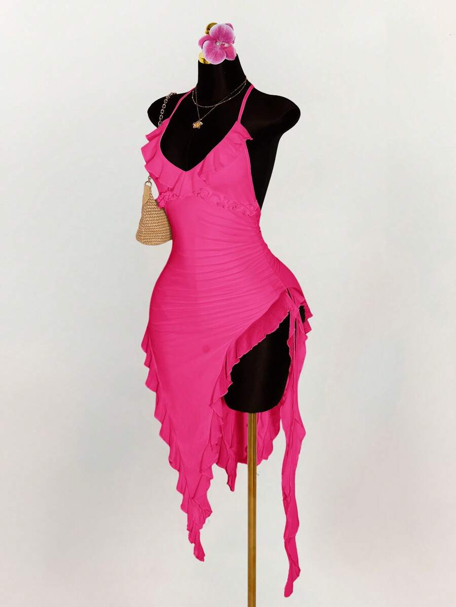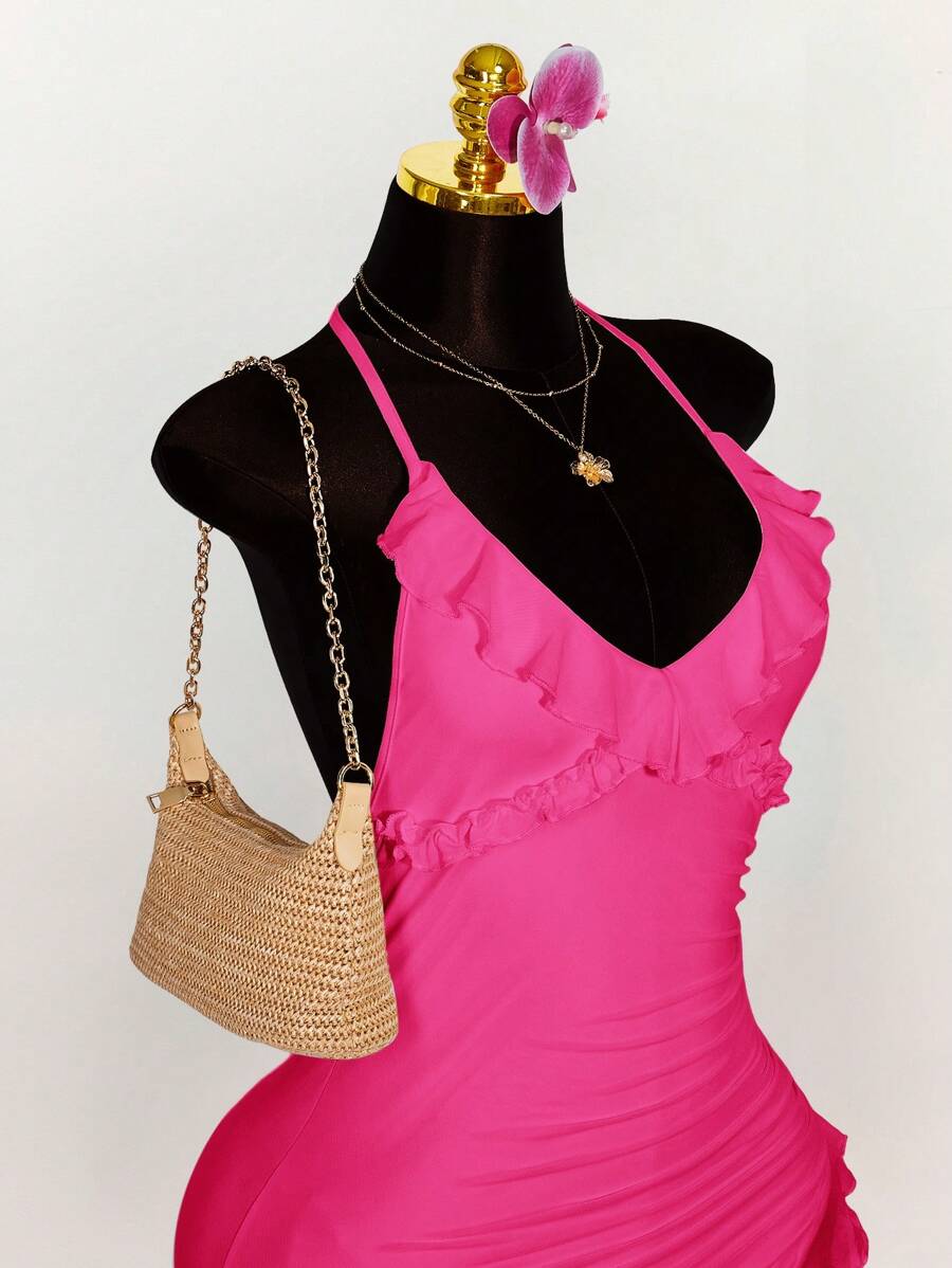 Amplova vestido halter ajustado con escote en v profundo, volantes y bajo asimetrico con volantes