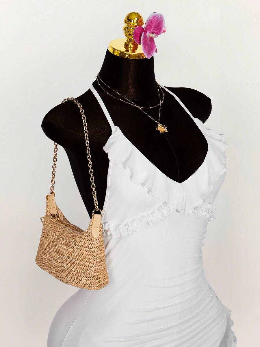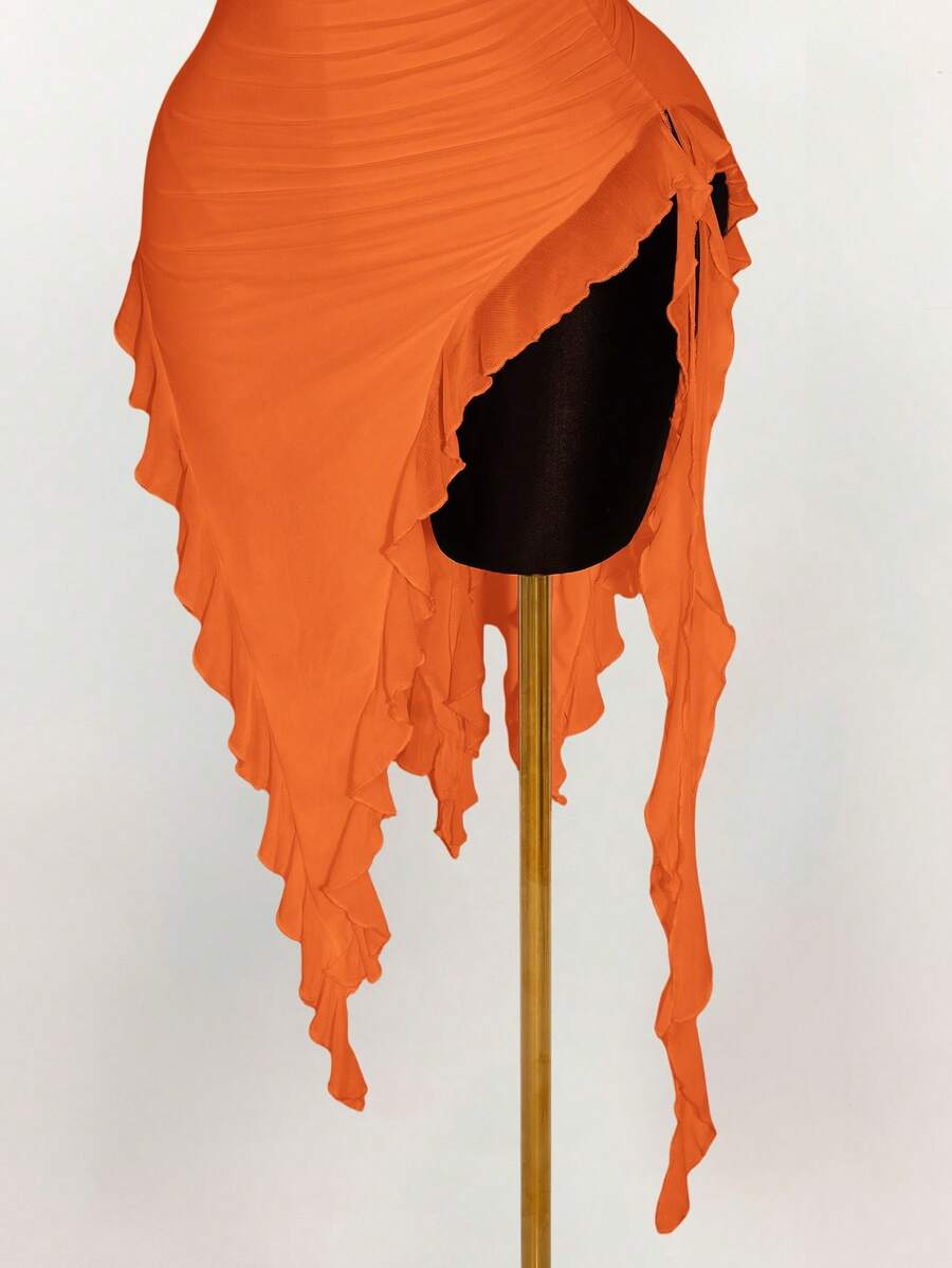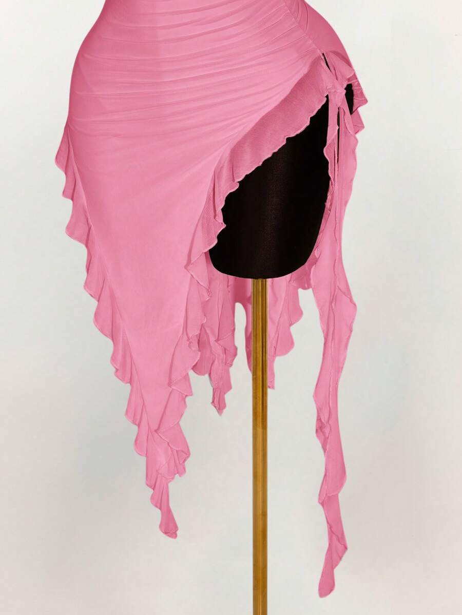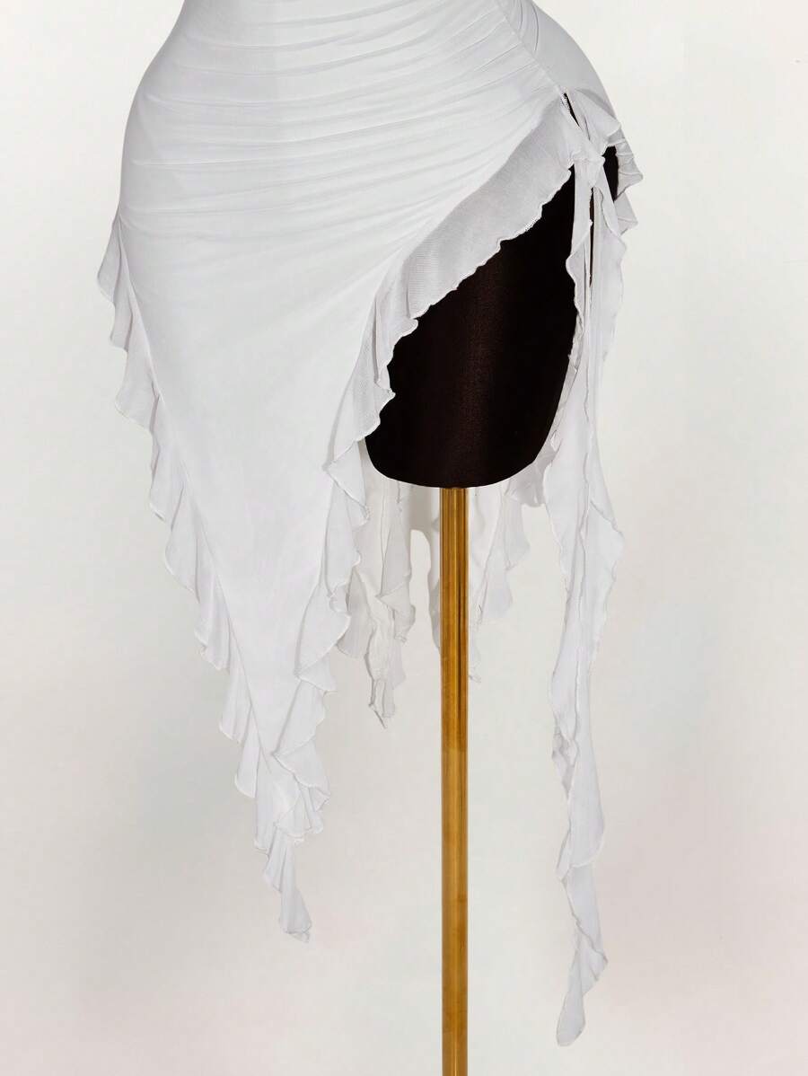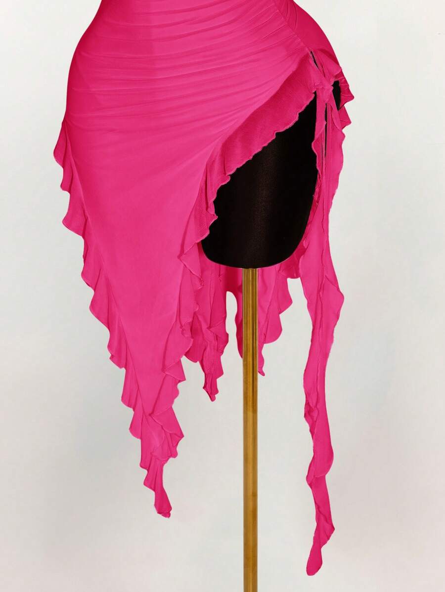 Amplova vestido halter ajustado con escote en v profundo, volantes y bajo asimetrico con volantes