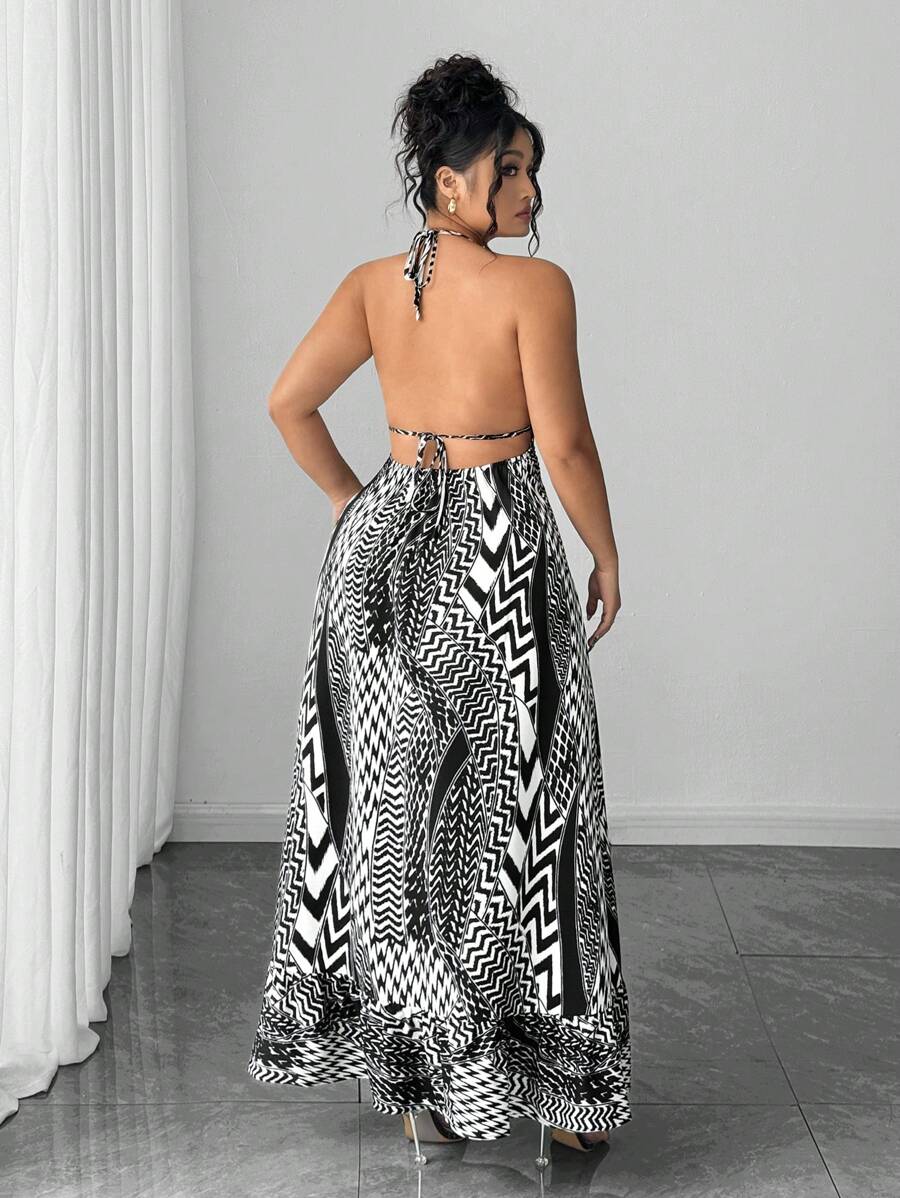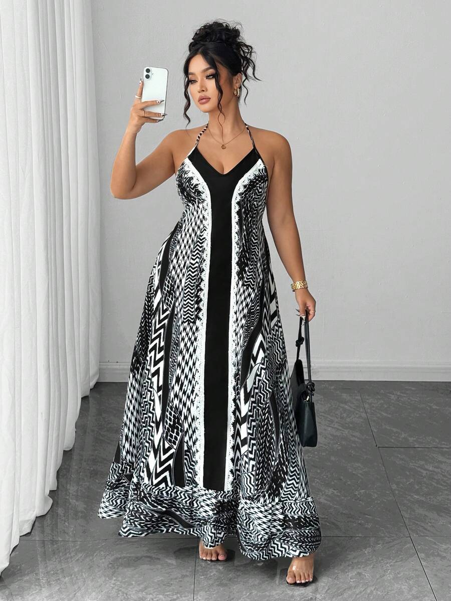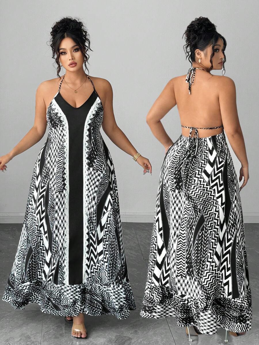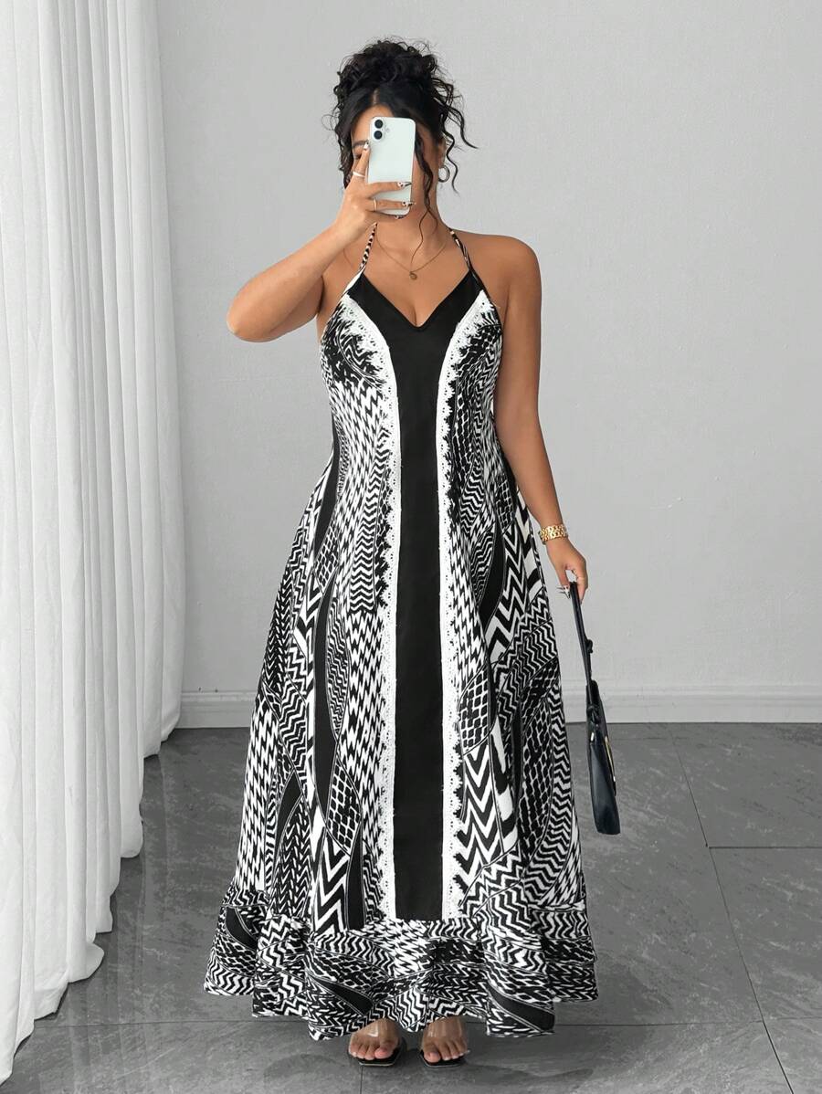Vestido de verano para mujer de talla grande con estilo de vacaciones, diseno patchwork, estampado y con espalda descubierta y lazo delantero