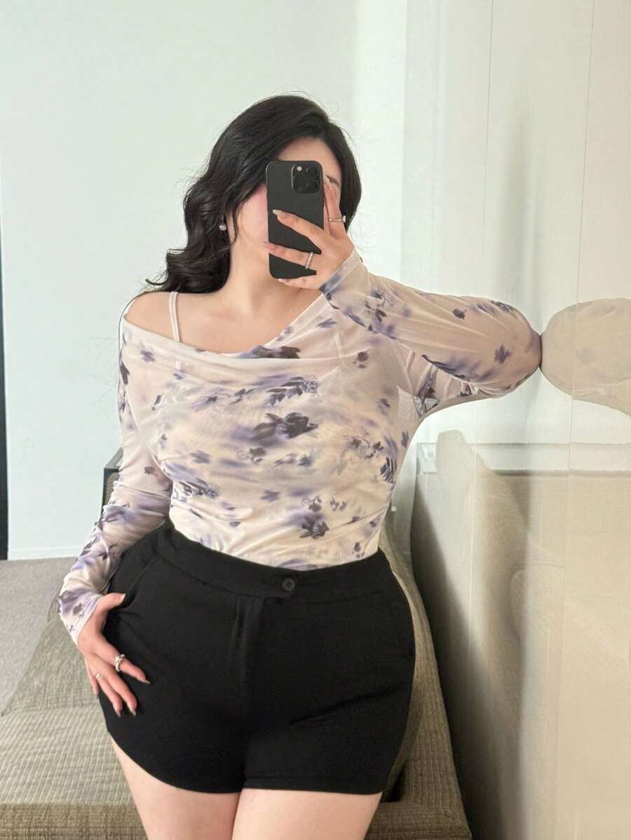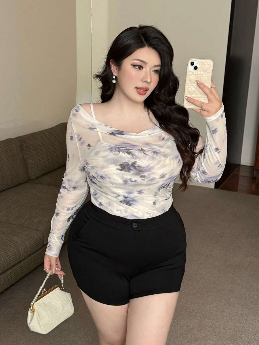 Vibekara camiseta de manga larga con tiras francesas y estampado floral en malla, silueta entallada, top con escote pronunciado para tallas grandes