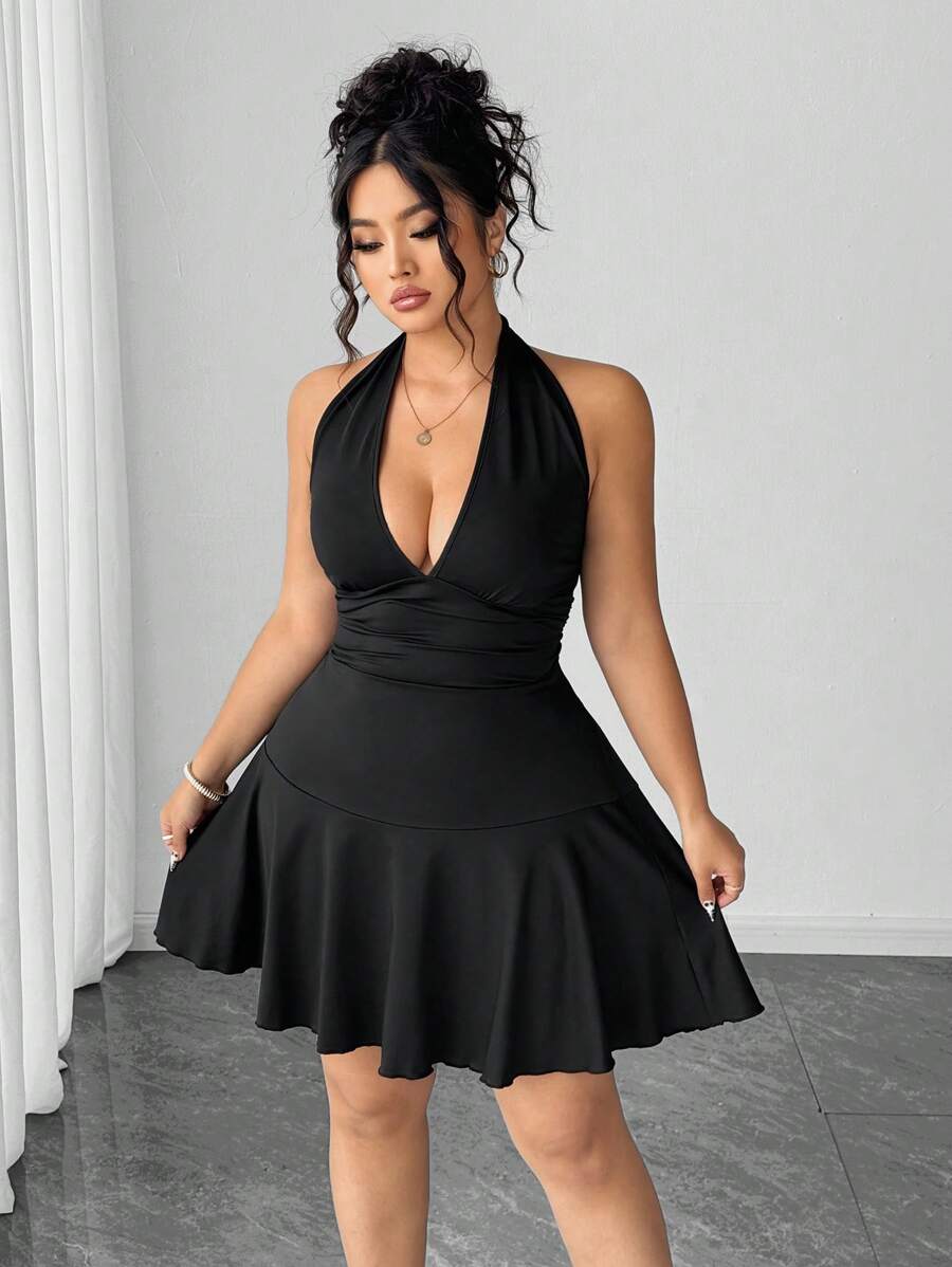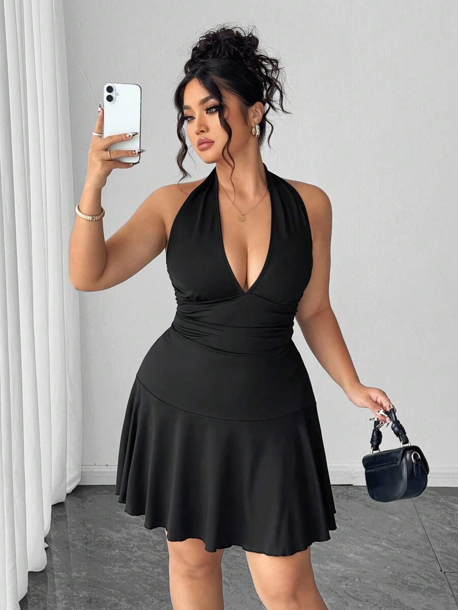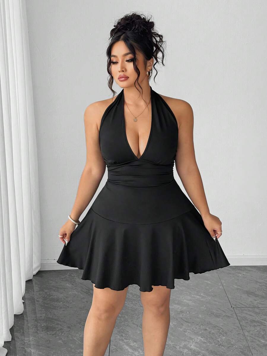 Vestido corto de verano elegante de punto de unicolor con escote en v profundo y espalda descubierta para mujer talla grande, vestido ajustado sexy con pliegues y lazo para fiestas, clubes y dias festivos
