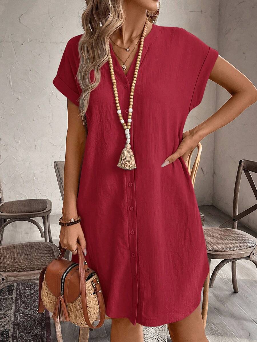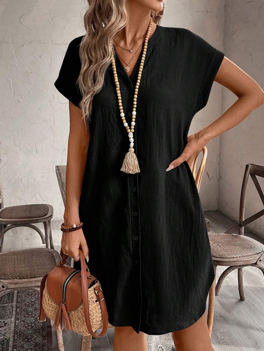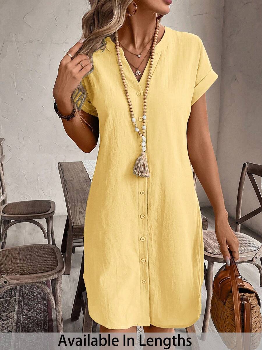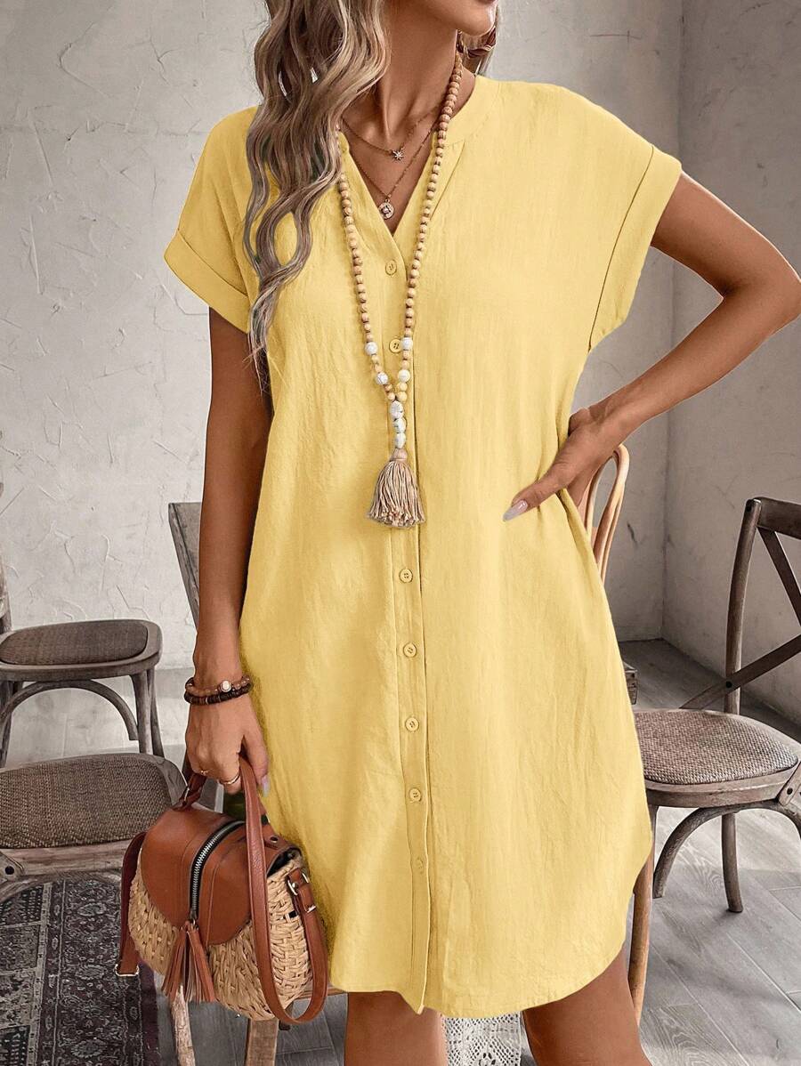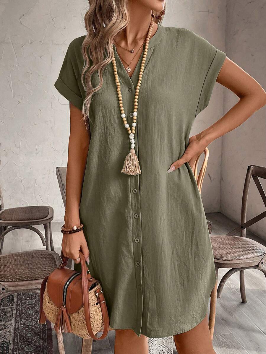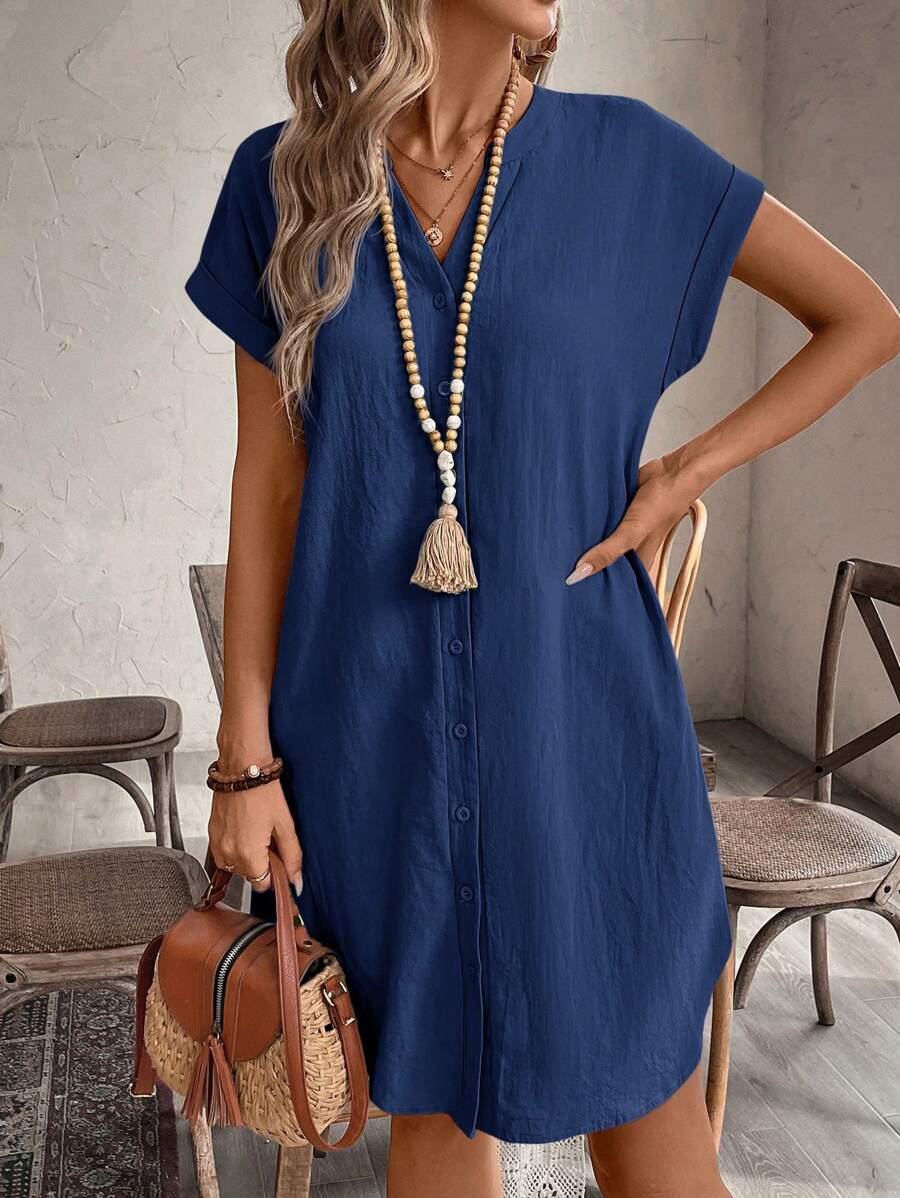 Curve vestido informal de talla grande para vacaciones con cuello en pico y botones frontales de unicolor
