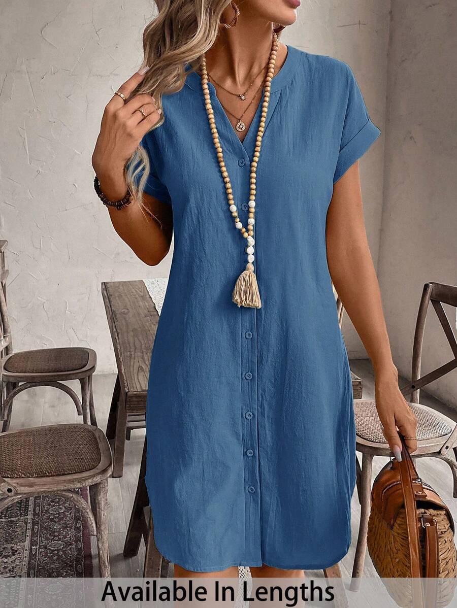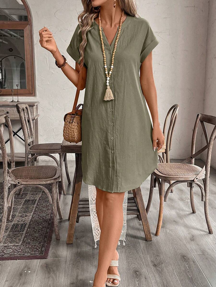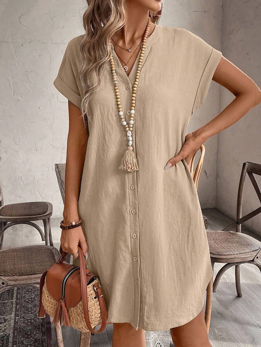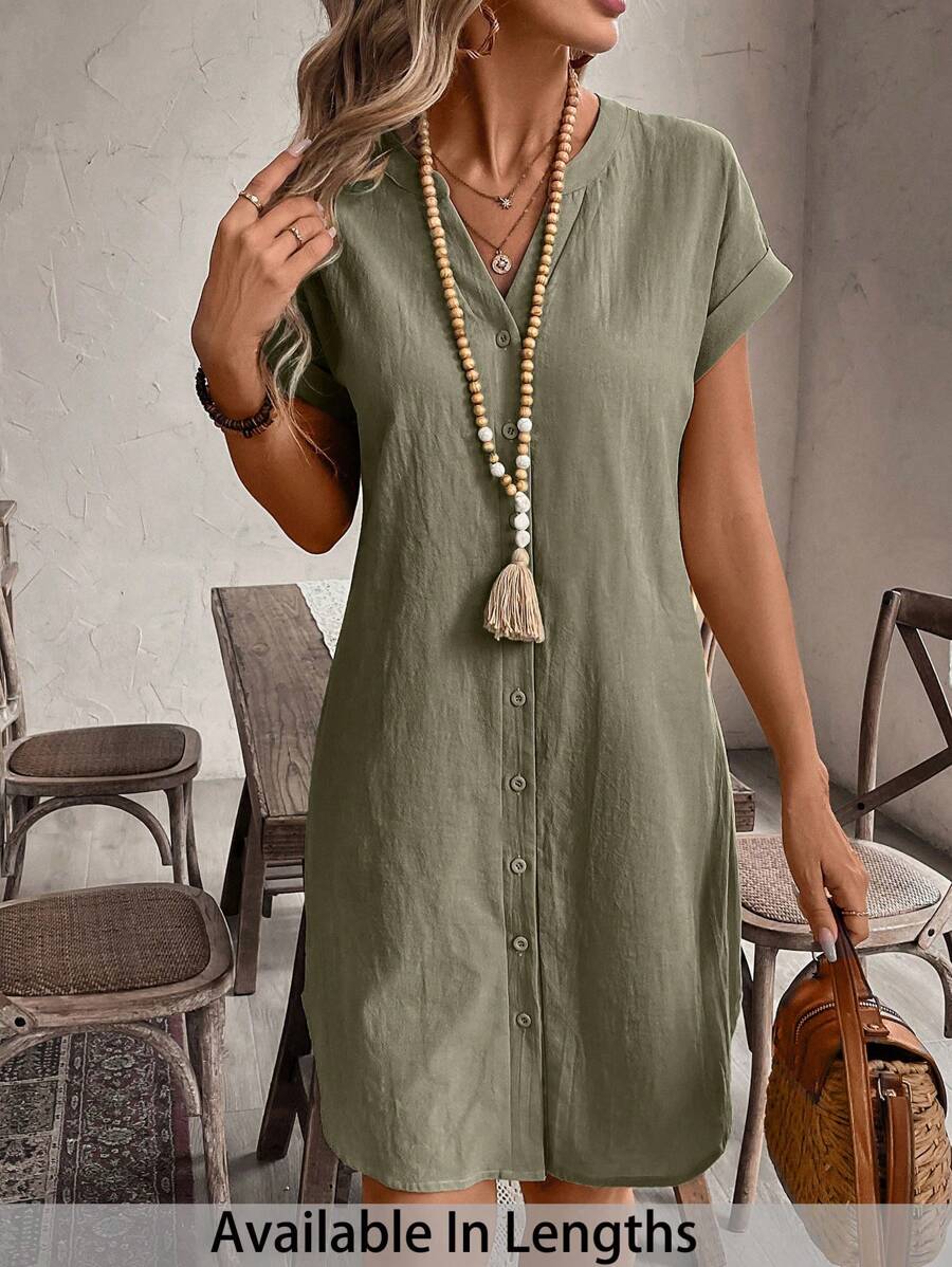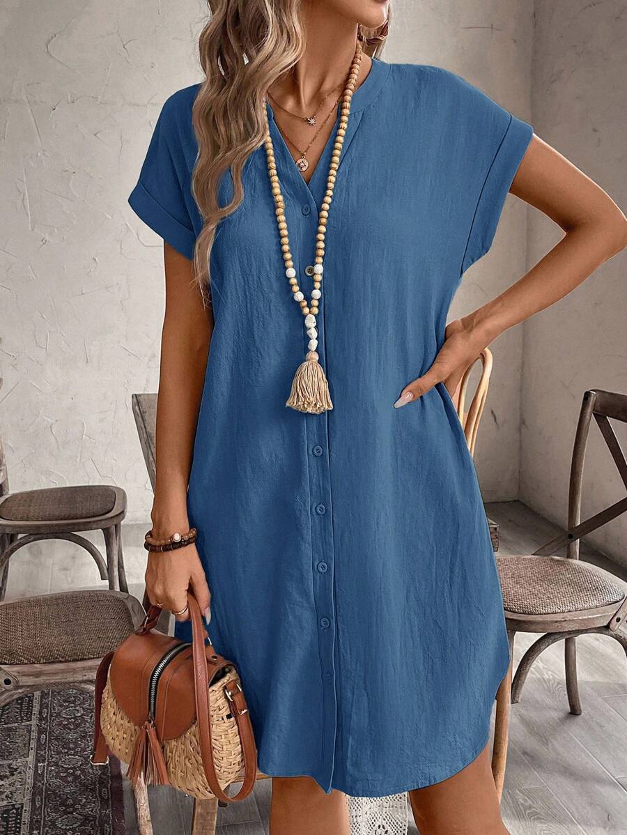 Curve vestido informal de talla grande para vacaciones con cuello en pico y botones frontales de unicolor