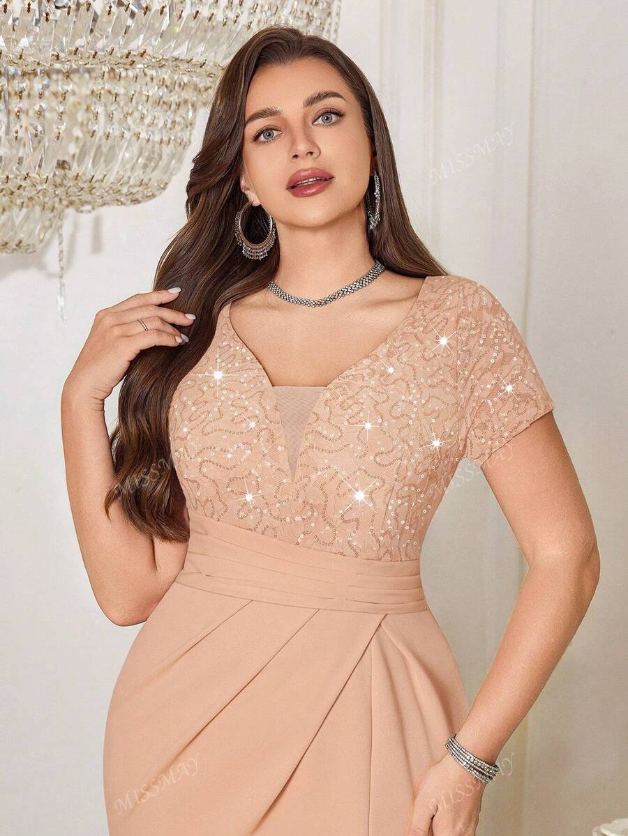 Vestido de coctel ajustado con cuello en v profundo, contraste de lentejuelas, encaje floral fruncido en la cintura, abertura en el muslo y bajo, ideal para fiestas, bodas, trabajo, cumpleanos, graduacion, cenas, regreso a casa