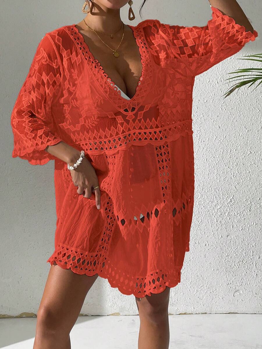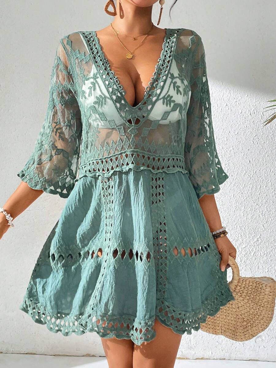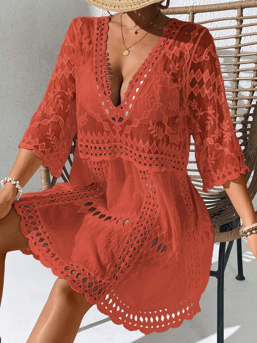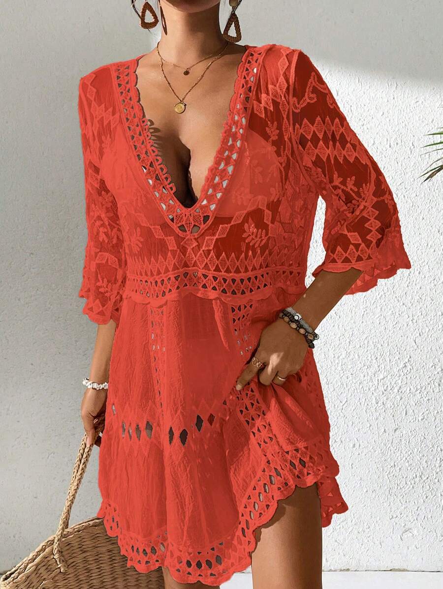 Vestido casual suelto estampado de un solo color con cuello en v profundo y hueco, como cubre traje de bano para mujer