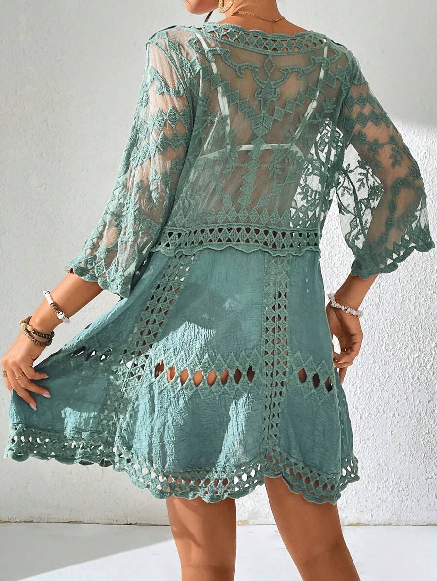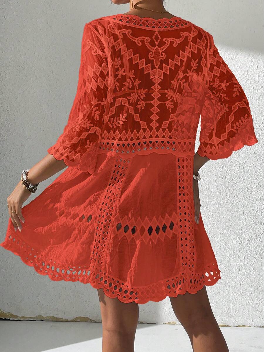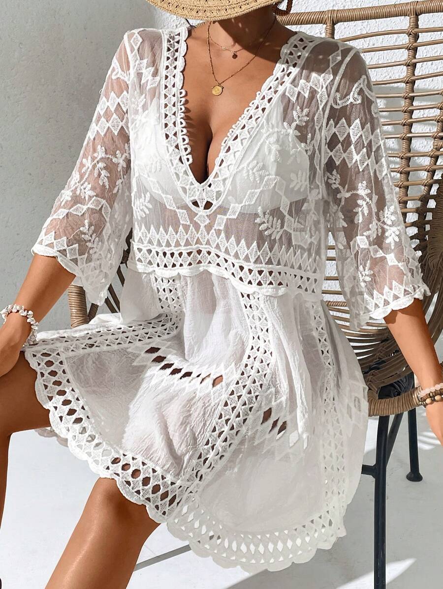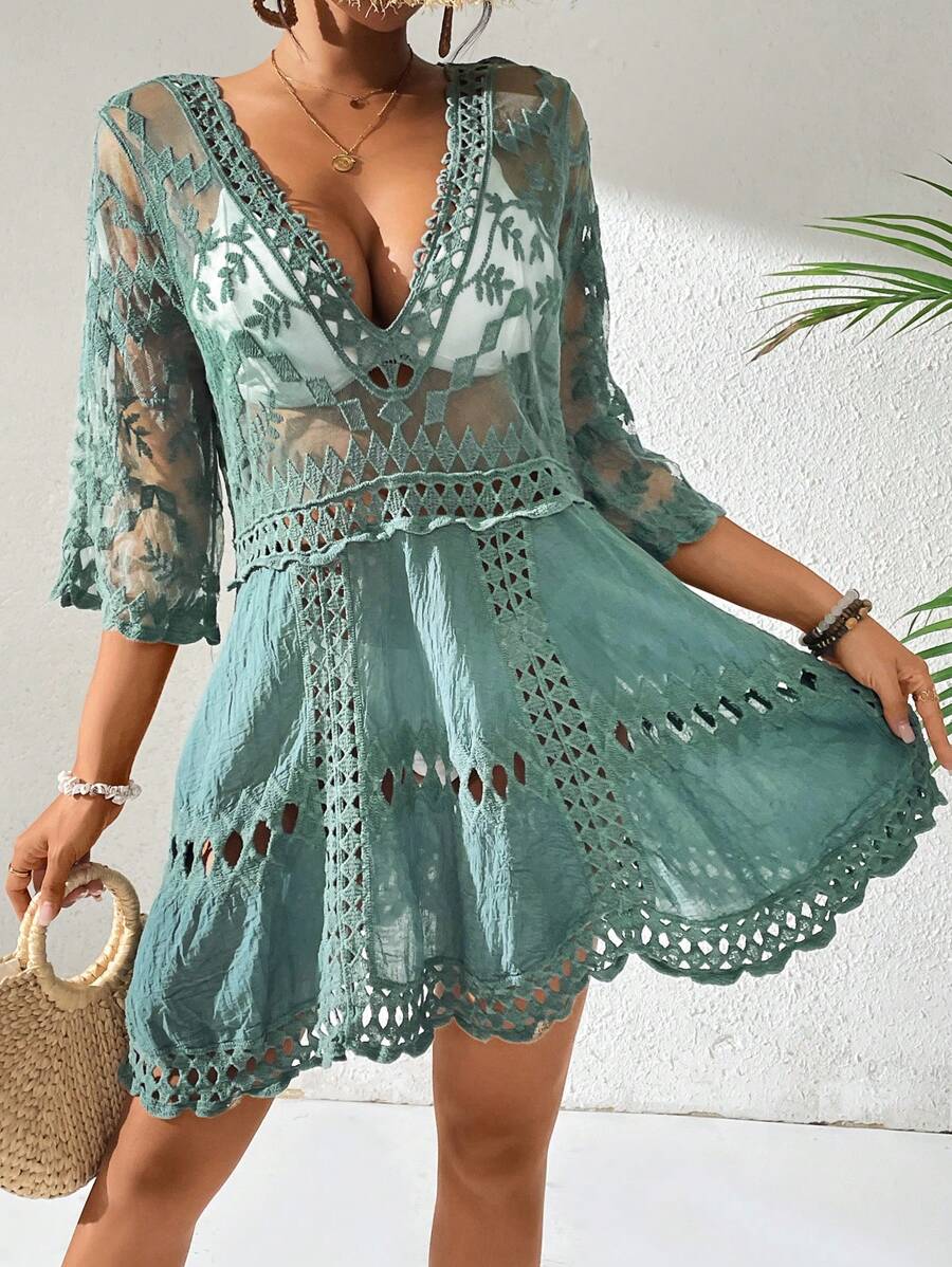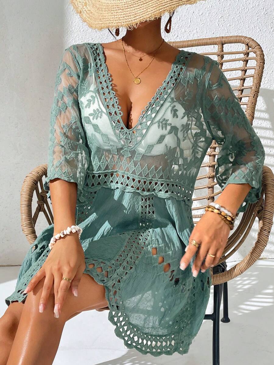 Vestido casual suelto estampado de un solo color con cuello en v profundo y hueco, como cubre traje de bano para mujer