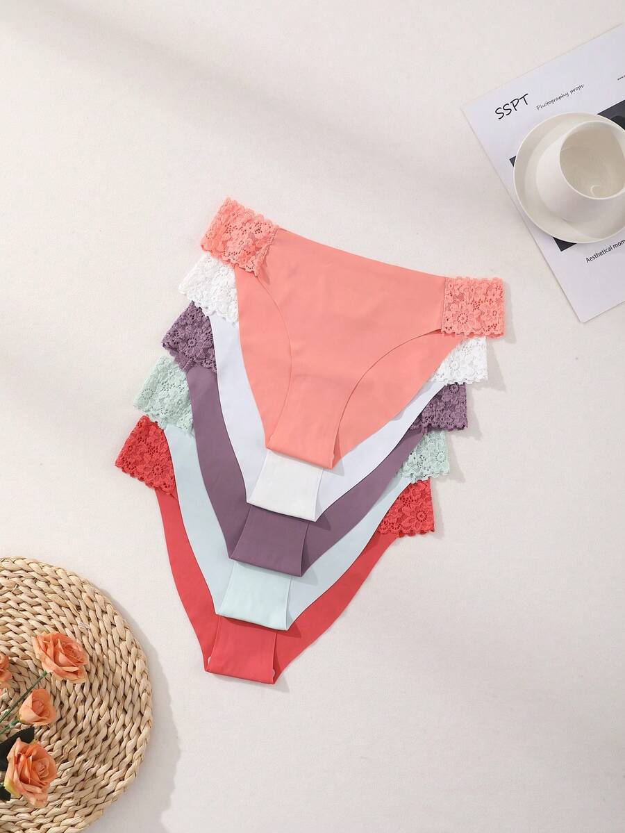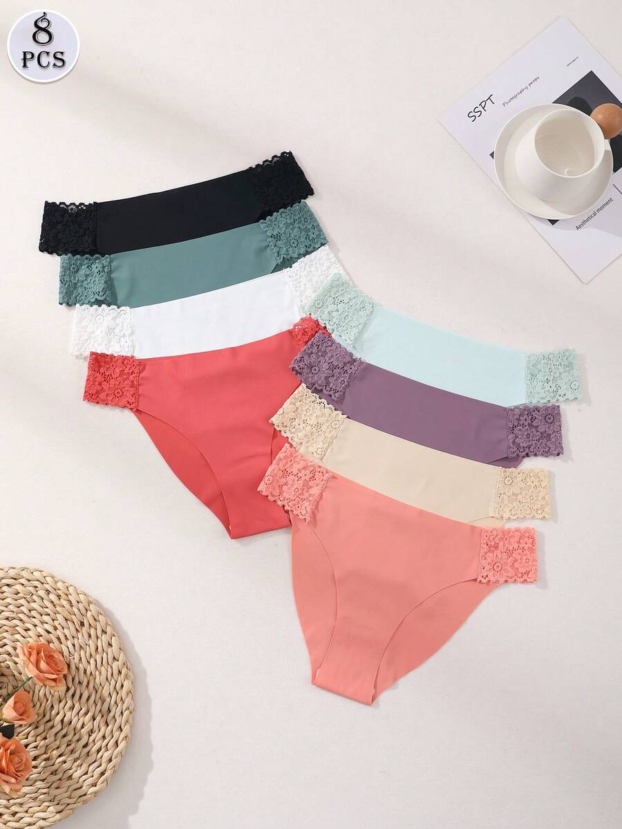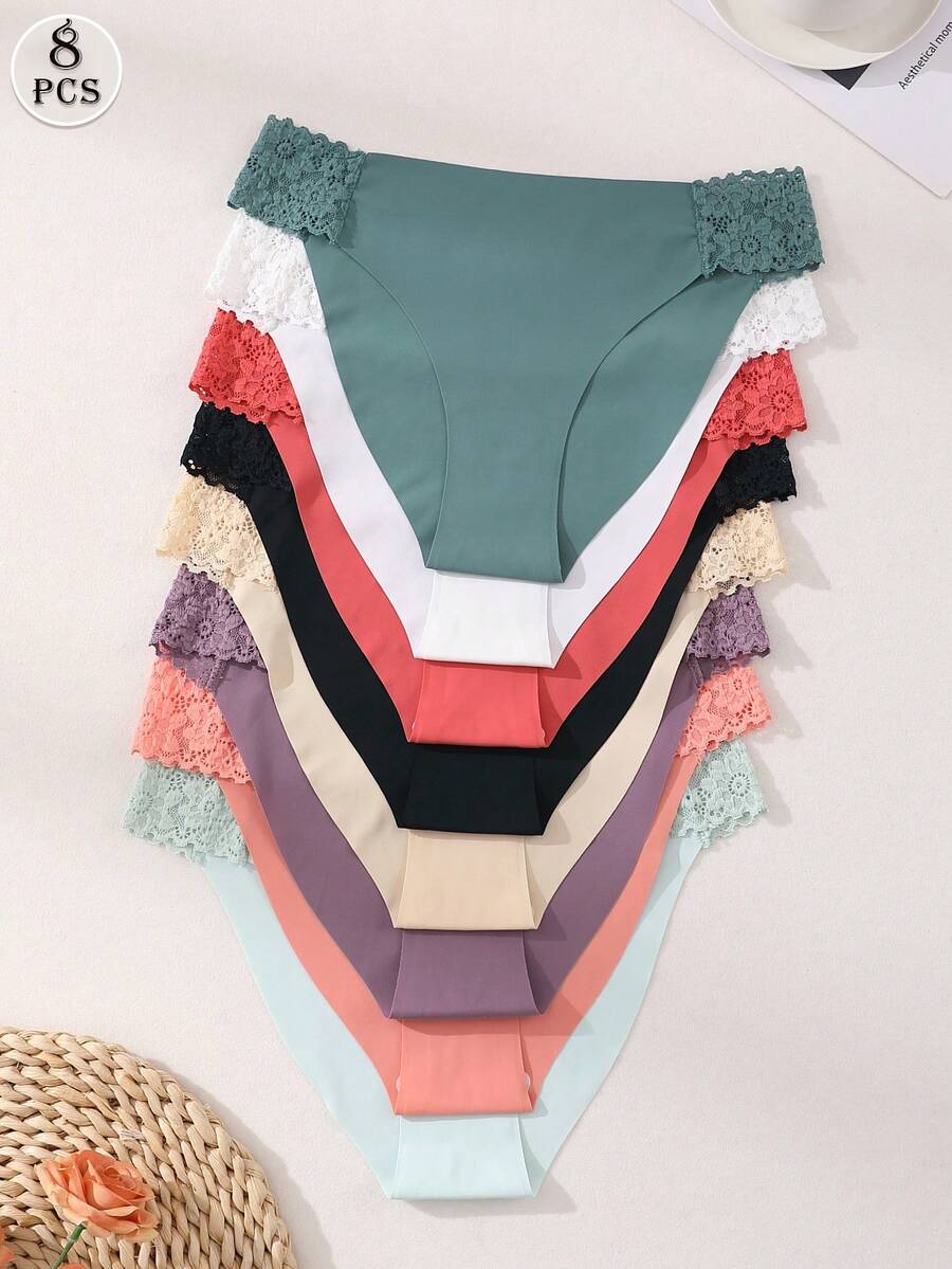 8 piezas de bragas comodas y sin costuras, con encaje y seda de leche, de unicolor, lenceria sexy y romantica para mujeres